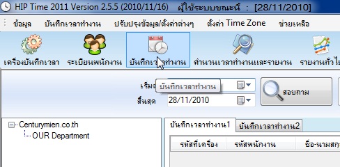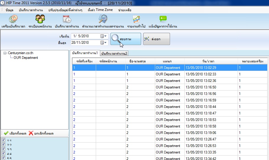 เป็นการดูข้อมูลการลงเวลาการเข้าออกของพนักงาน ซึ่งการแสดงรูปแบบนี้ให้เลือกแผนกที่ต้องการจะแสดง เลือกพนักงาน เลือกช่วงวันที่ที่ต้องการแสดงแล้วคลิก สอบถาม หากมีข้อมูลการบันทึกเวลาจะแสดงออกมาดังรูปด้านบน